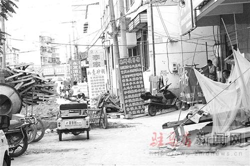 一些门面房前堆满了啤酒、西瓜,有的小饭店干脆将灶台和桌椅板凳全部放在路边,店外经营。不仅如此,许多商户还在门前设置了高大的广告牌,配上道路上堆积的建筑材料及建筑机械,与其说这是一条道路,倒不如说这是一个城中村的集贸市场(如图一)。