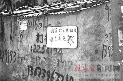 在村中一排破旧的简易房墙上,一个明显的白底黑字的标语,上面写着“谁在此丢垃圾是畜生、乌龟。”为了表示对丢垃圾者的不满,写标语者还专门在后面画了一个乌龟的图案(如图二)。然而,记者看到,骂人的标语旁,照样有人丢垃圾。