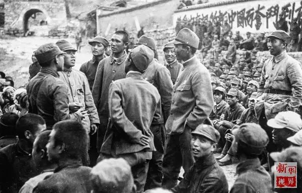 ↑被八路军俘虏的日本士兵,在被遣送回国前,唱歌与八路军告别。 新华社发 (沙飞摄)