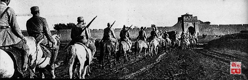 ↑1945年8月,八路军晋绥部队解放兴和城,骑兵部队列队进城。