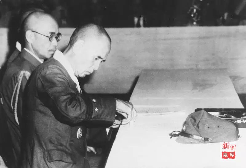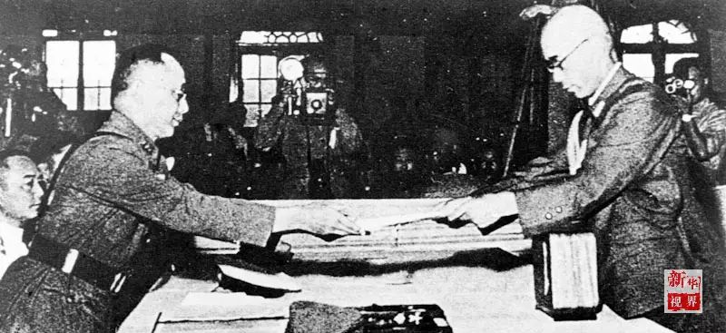 ↑侵华日军总司令冈村宁次代表日军签署投降书。