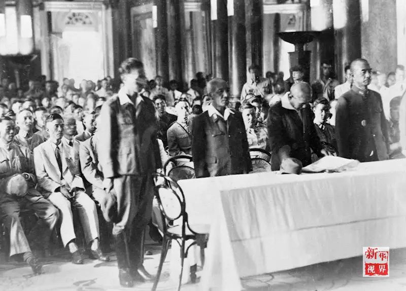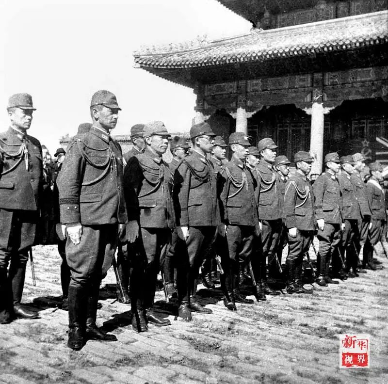↑侵华日军签降仪式在北平故宫太和殿前举行,这是参加签降仪式的日本军队代表,等待签字后举行交刀仪式(1945年10月10日摄)。