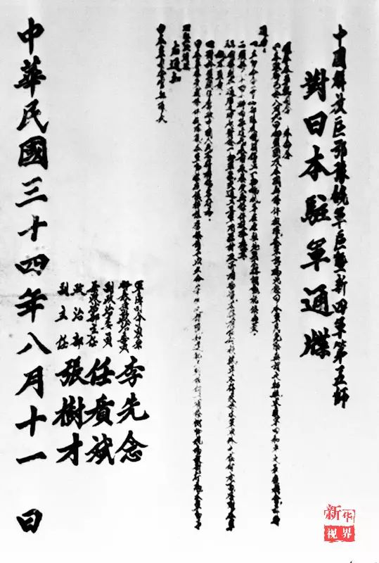 ↑新四军第五师命令日军投降的通牒。