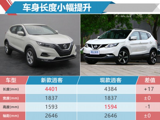 新款逍客的车身长宽高分别为4401×1837×1593mm,轴距为2646mm。相较现款车型的车身尺寸(4384×1837×1594mm),新车在长度上有所增加,而高度上却下降了1mm。