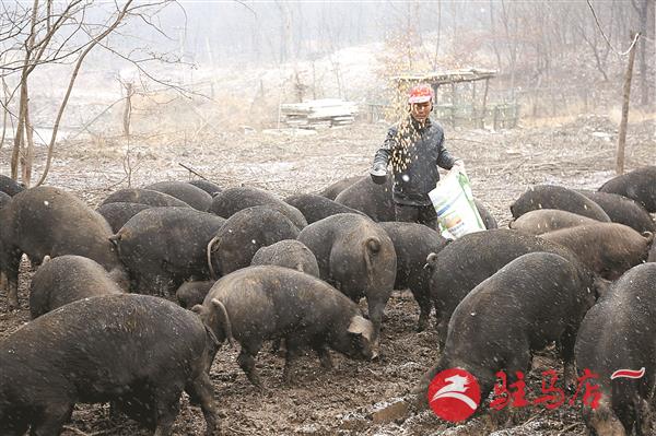 1月8日,在确山县任店镇和尚庄村的胜凯种植专业合作社,农民在给黑猪喂食玉米。该合作社负责人李广介绍,白天这些黑猪都在山上散养,吃橡子、野草、野果等,晚上归圈。因为黑猪运动量大、肉质好,是地道的生态猪。春节临近,该合作社的订单不断。