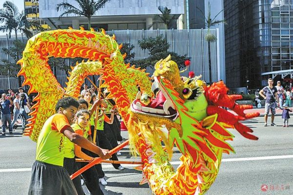 8月11日,巴西演员在圣保罗市保利斯塔大街进行舞龙表演。