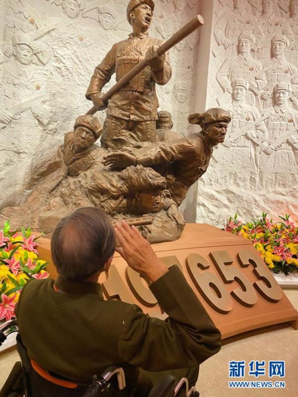 在纪念中国人民志愿军抗美援朝出国作战70周年主题展览上,杜文亮老人向抗美援朝英雄雕像敬礼(2020年10月27日摄)。新华社记者 任沁沁 摄