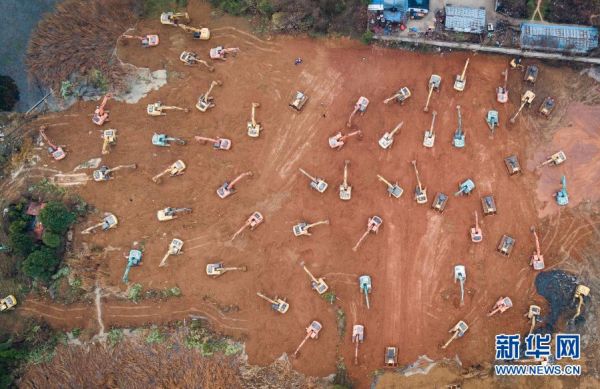 大型机械在武汉火神山医院建设工地施工(2020年1月24日摄,无人机照片)。新华社记者 肖艺九 摄