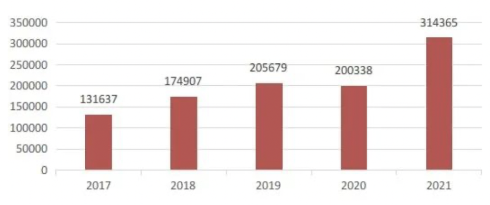 图为2017年-2021年间,人民法院在法律框架内运用社会主义核心价值观释法说理一审民事案件数量分布情况