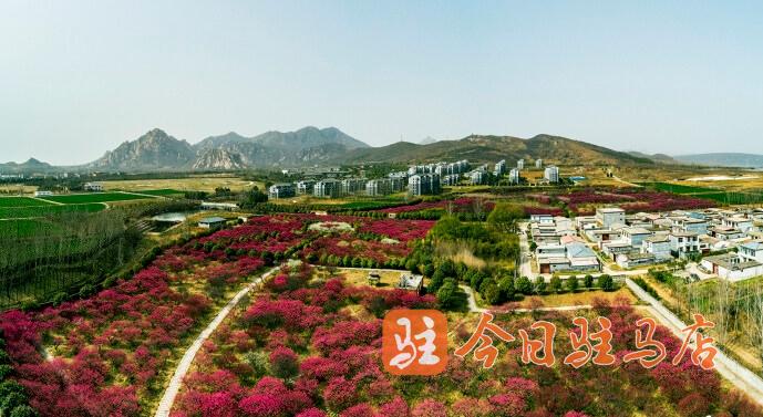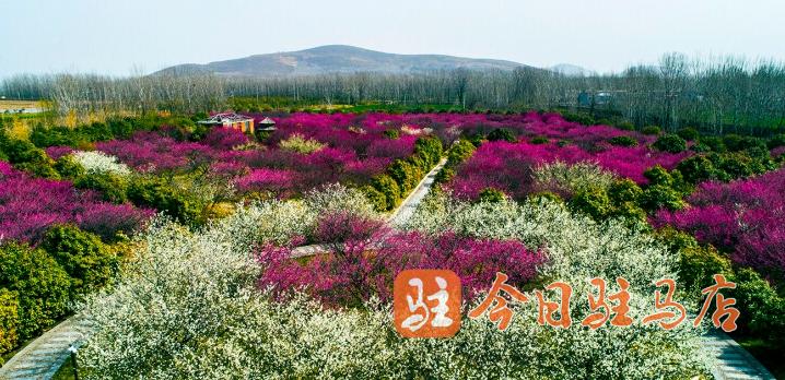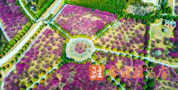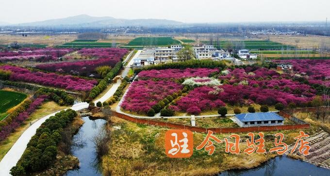 这是全媒体记者于3月7日上午用无人机航拍位于驻马店市遂平县嵖岈山温泉小镇的梅园文化产业扶贫基地,如今这里的各种梅花已经进入盛花期。
