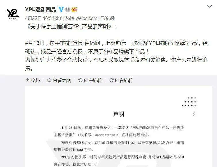 一场商业直播在开展前,就应该对对方的产品做好严格的核查,在确认真实、规范、合法之后,再去进行直播带货。这个先后顺序不应该颠倒,而应该成为直播界最起码的规矩,也应该是个基本常识。“YPL运动潮品”已经明确表示,针对线上销售,YPL有权对相关产品链接、店铺、主播等进行同步追责。