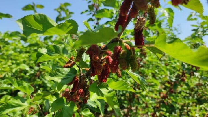 走进果园,像穿过绿意盎然的“隧道”,拨开树叶,跃入眼帘的是一簇簇粉的、红的、黑的桑葚挂满枝头,晶莹透亮,让人垂涎欲滴。据园主赵俊峰介绍,他种植了50亩桑葚,今年是第6个年头。今年桑葚挂果多,颗粒饱满,甘甜。