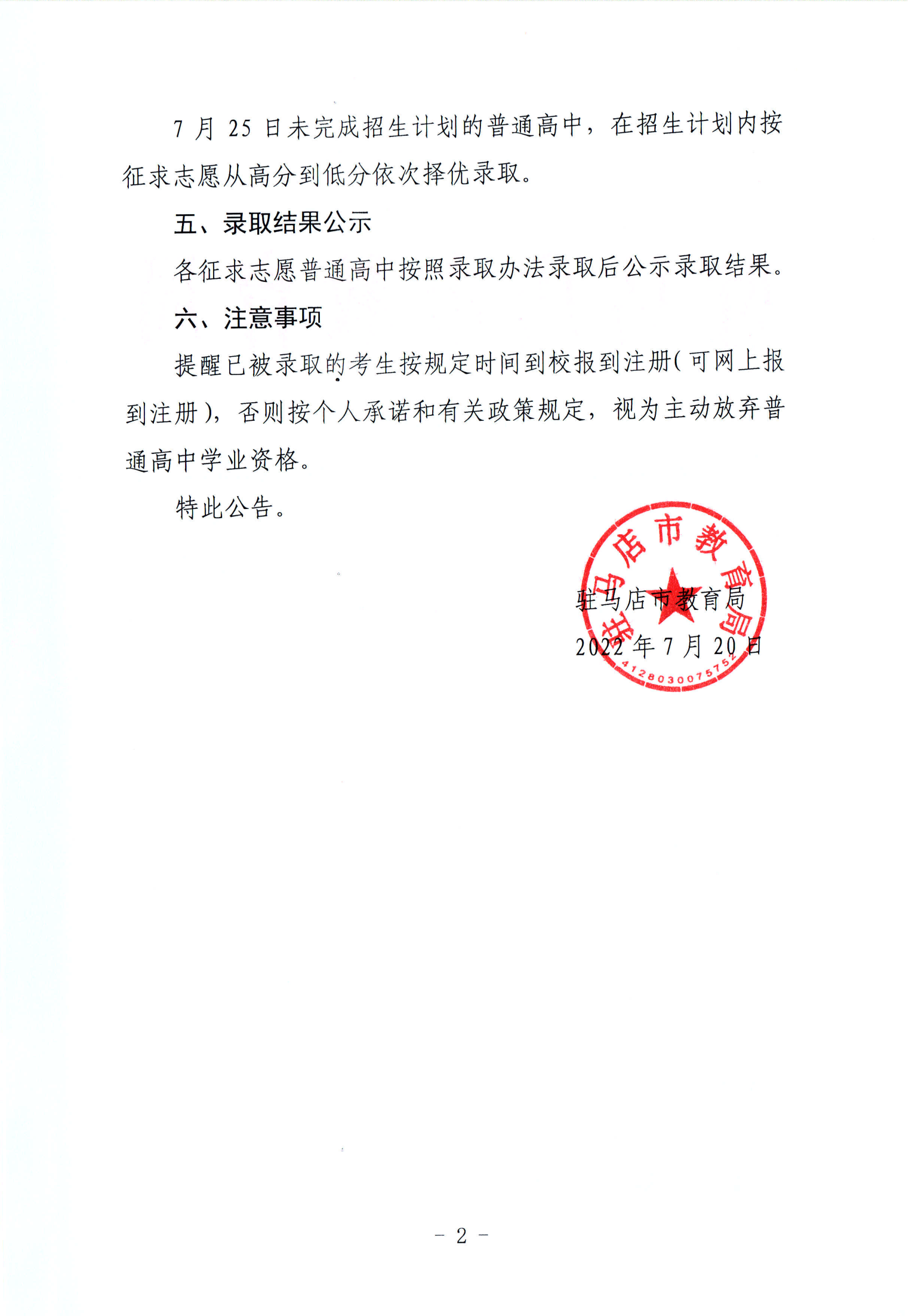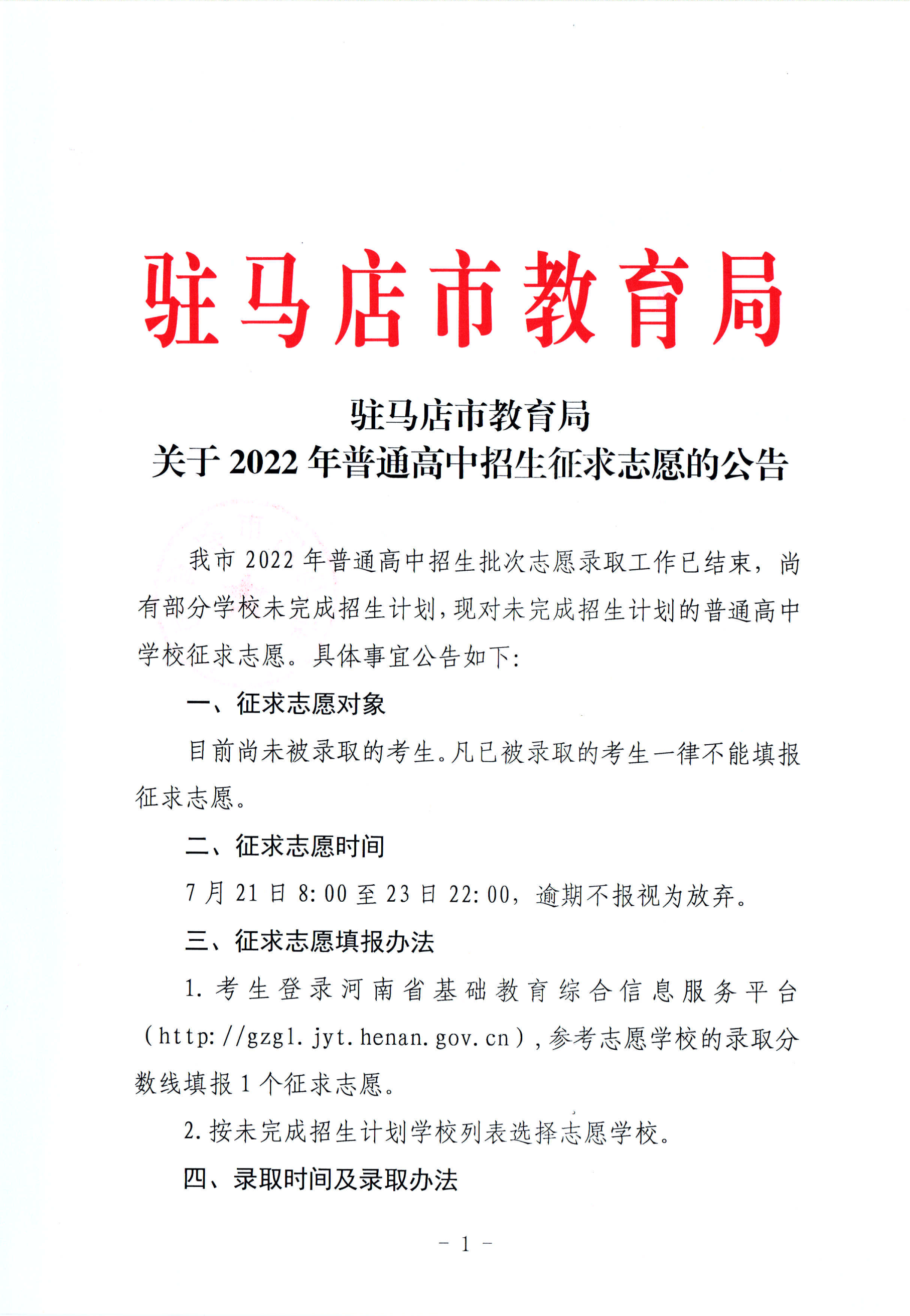 2022年普通高中招生征求志愿 驻马店市教育局发布公告
