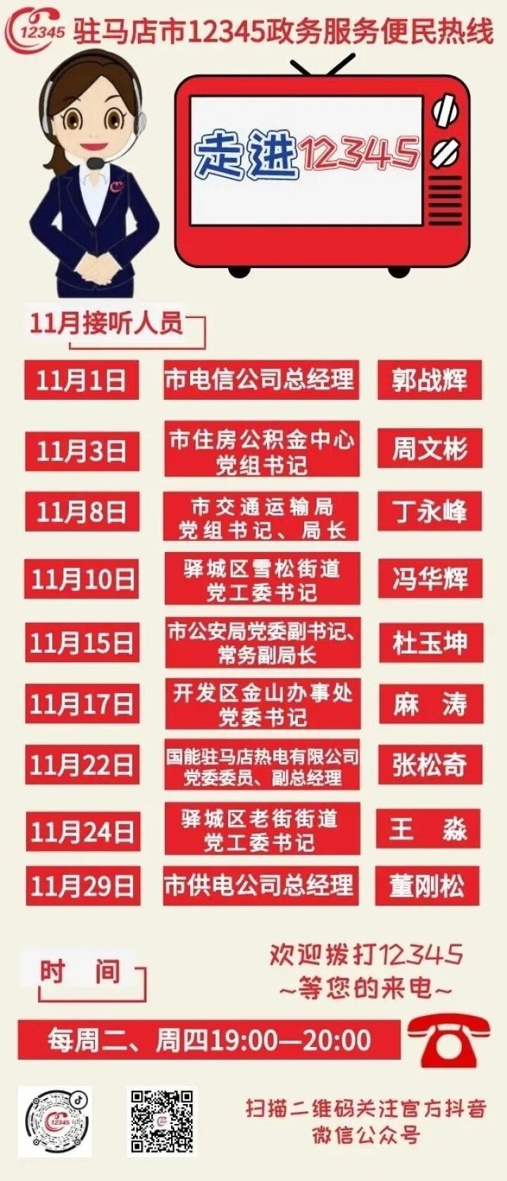 按照《驻马店市人民政府办公室关于建立市直单位现场接听12345热线电话制度的通知》(驻政办明电〔2019〕103号)、《驻马店市12345政务服务便民热线中心关于2022年11月份市直单位、中心城区区直单位及乡镇(街道)现场接听12345热线电话的通知》(驻热线文〔2022〕11号)相关要求,11月1日市电信公司总经理郭战辉,11月3日市住房公积金中心党组书记周文彬,11月8日市交通运输局党组书记、局长丁永峰,11月10日驿城区雪松街道党工委书记冯华辉,11月15日市公安局党委副书记、常务副局长杜玉坤,11月17日开发区金山办事处党委书记麻涛,11月22日国能驻马店热电有限公司党委委员、副总经理张松奇,11月24日驿城区老街街道党工委书记王淼,11月29日市供电公司总经理董刚松将接听12345热线。