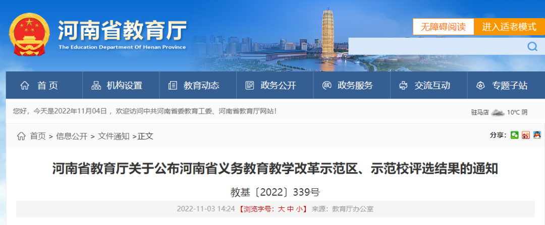 《关于公布河南省义务教育教学改革示范区、示范校评选结果的通知》