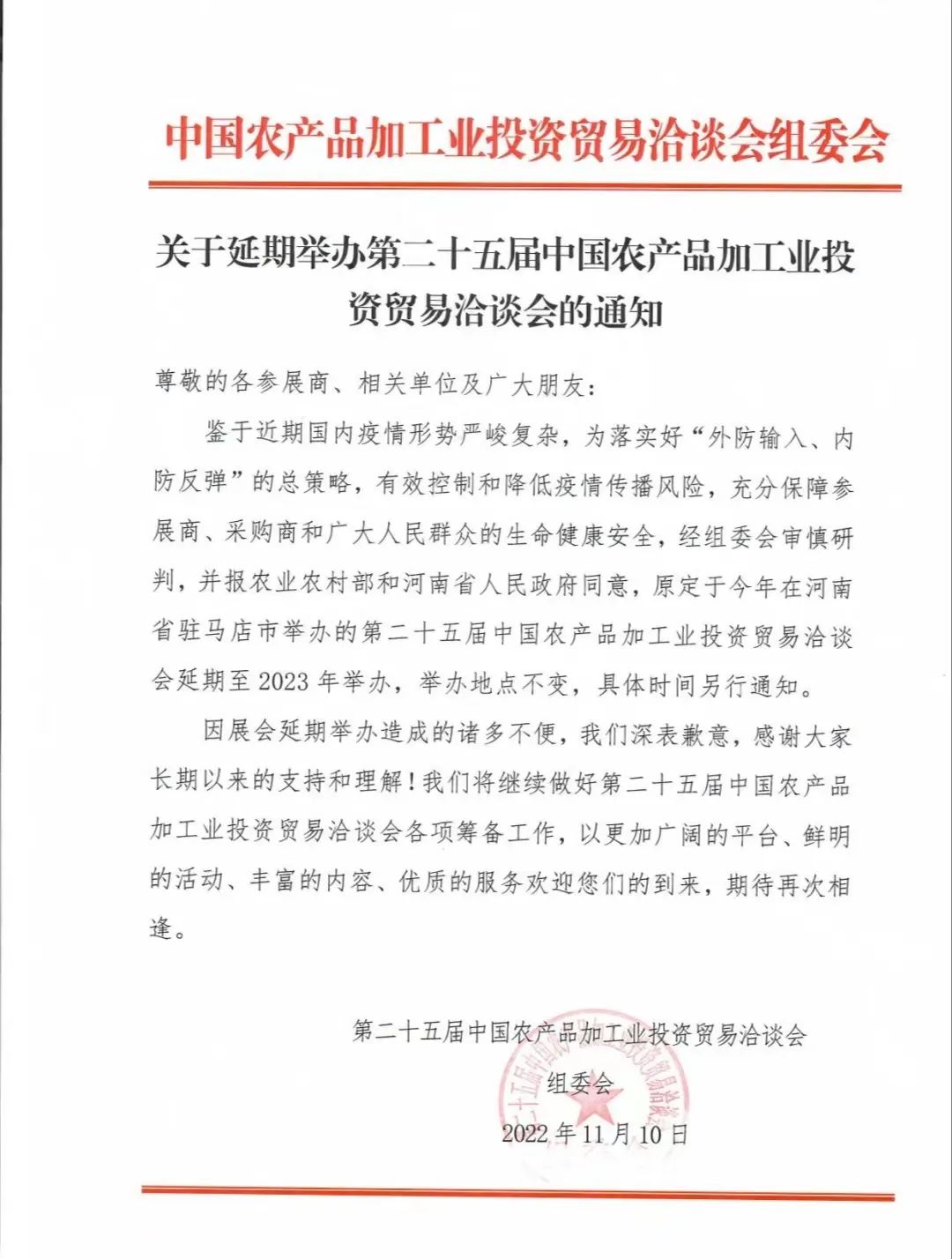 鉴于近期国内疫情形势严峻复杂,为落实好“外防输入、内防反弹”的总策略,有效控制和降低疫情传播风险,充分保障参展商、采购商和广大人民群众的生命健康安全,经组委会审慎研判,并报农业农村部和河南省人民政府同意,原定于今年在河南省驻马店市举办的第二十五届中国农产品加工业投资贸易洽谈会延期至2023年举办,举办地点不变,具体时间另行通知。