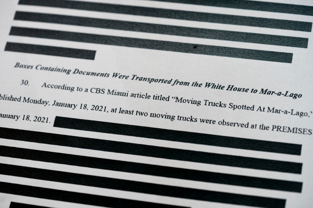这是2022年8月26日拍摄的美国联邦调查局申请搜查前总统特朗普住所海湖庄园时向法院提交书面证词的部分内容。新华社记者刘杰摄