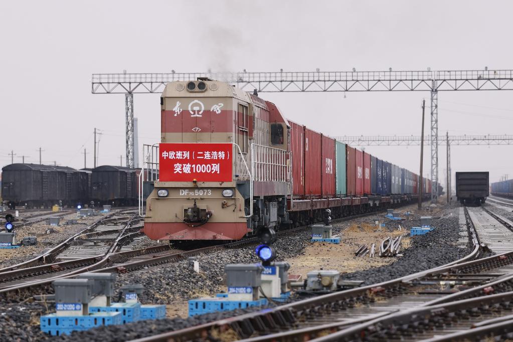 5月4日,一列中欧班列从二连浩特铁路口岸驶出。新华社发(夏亮 摄)