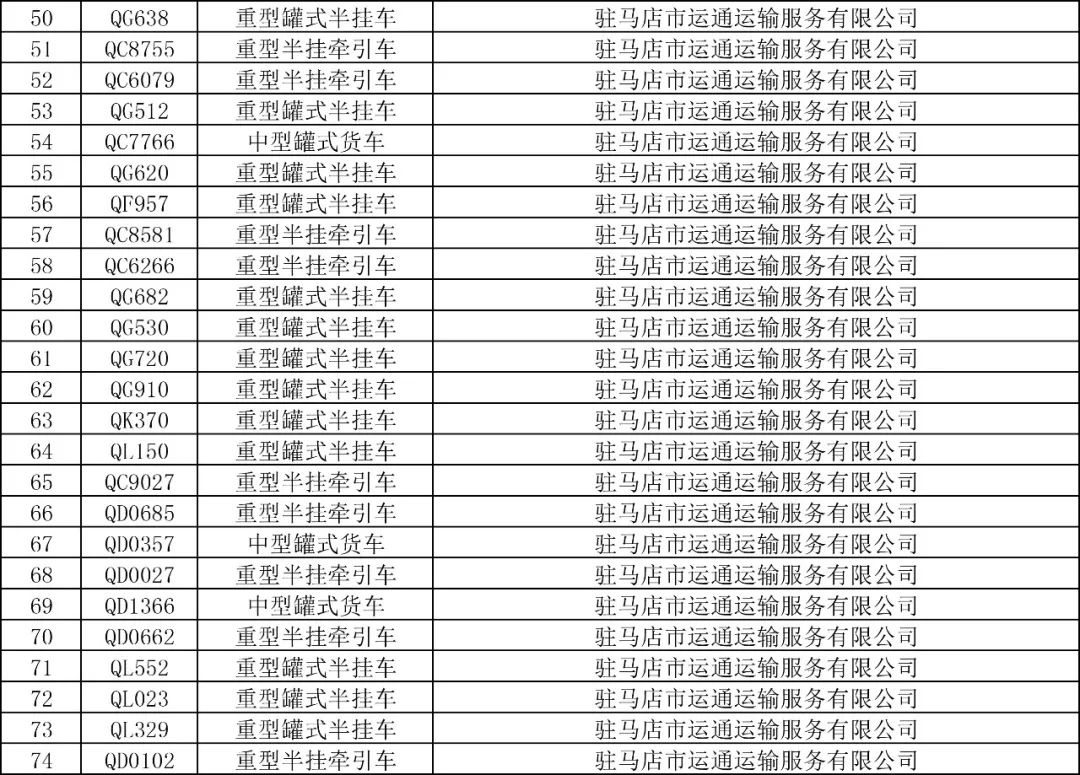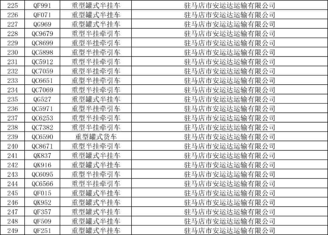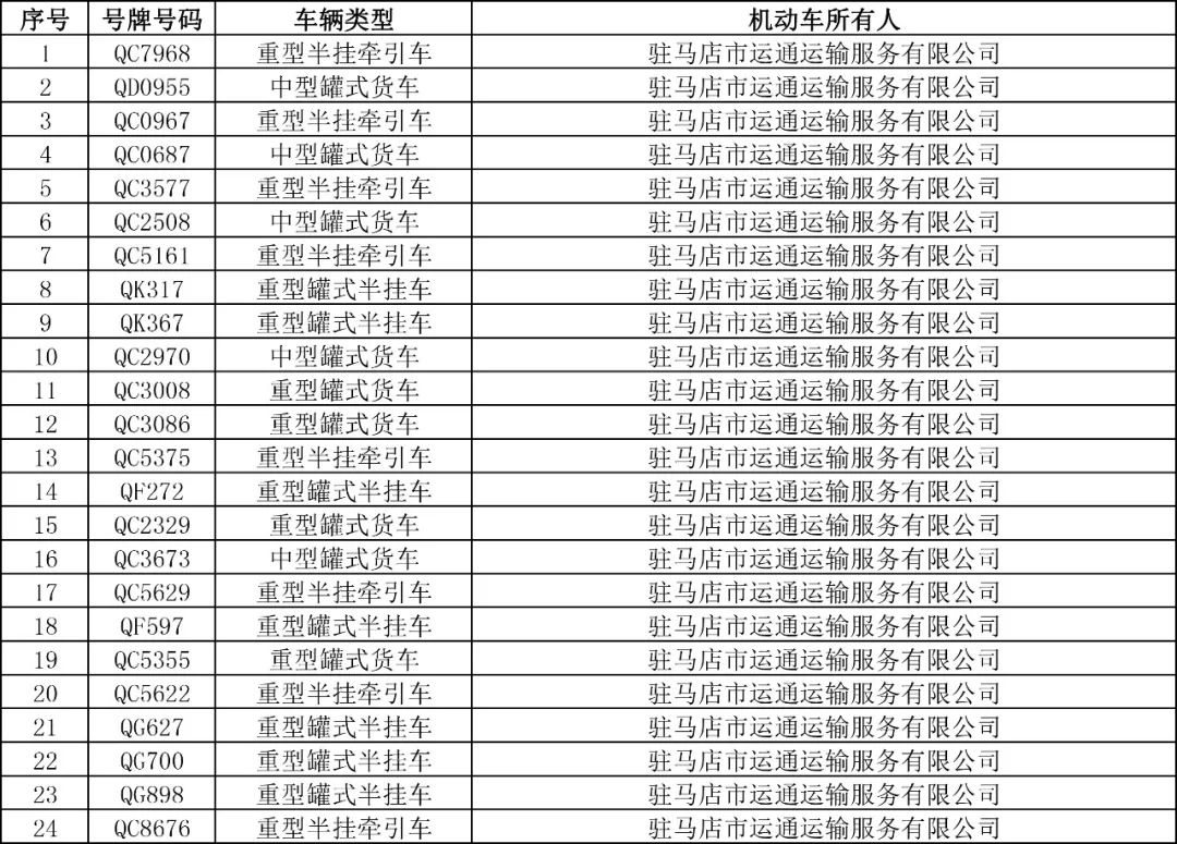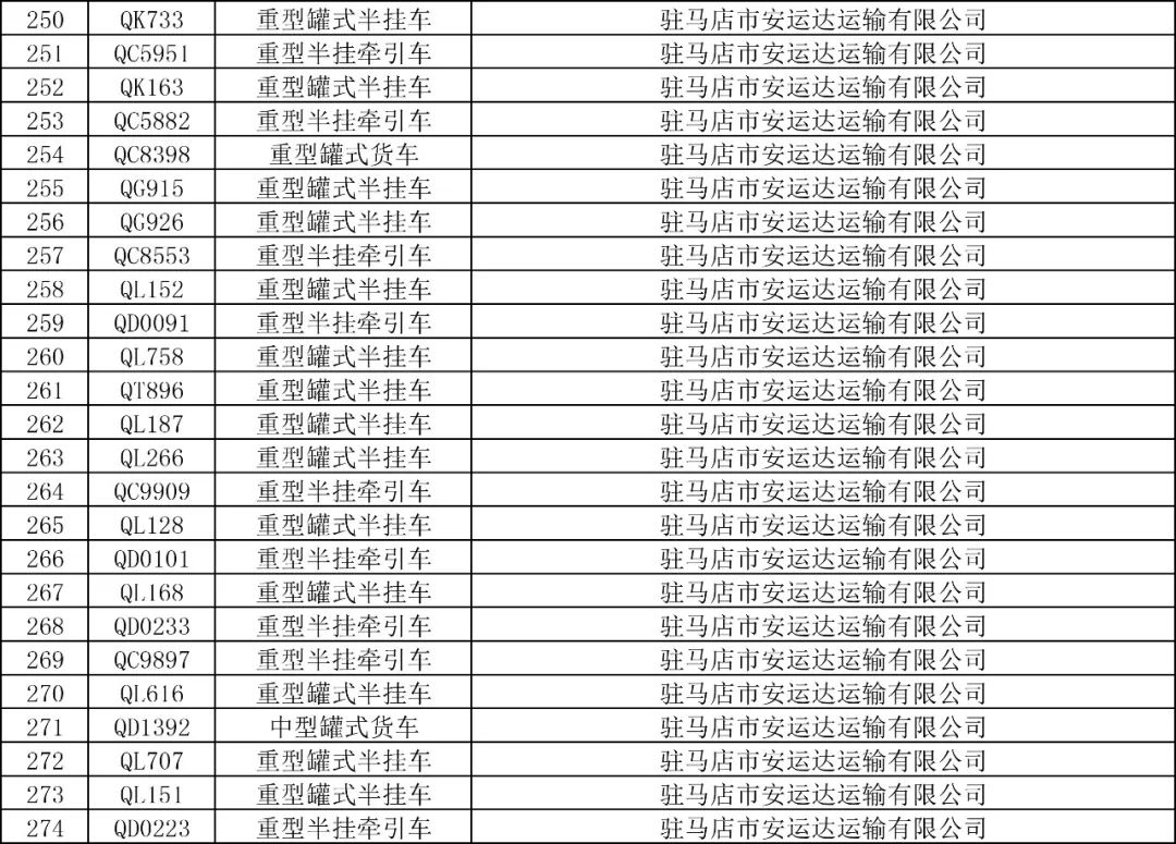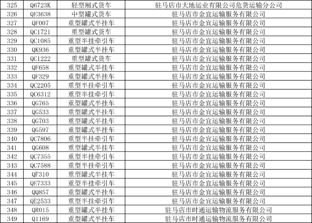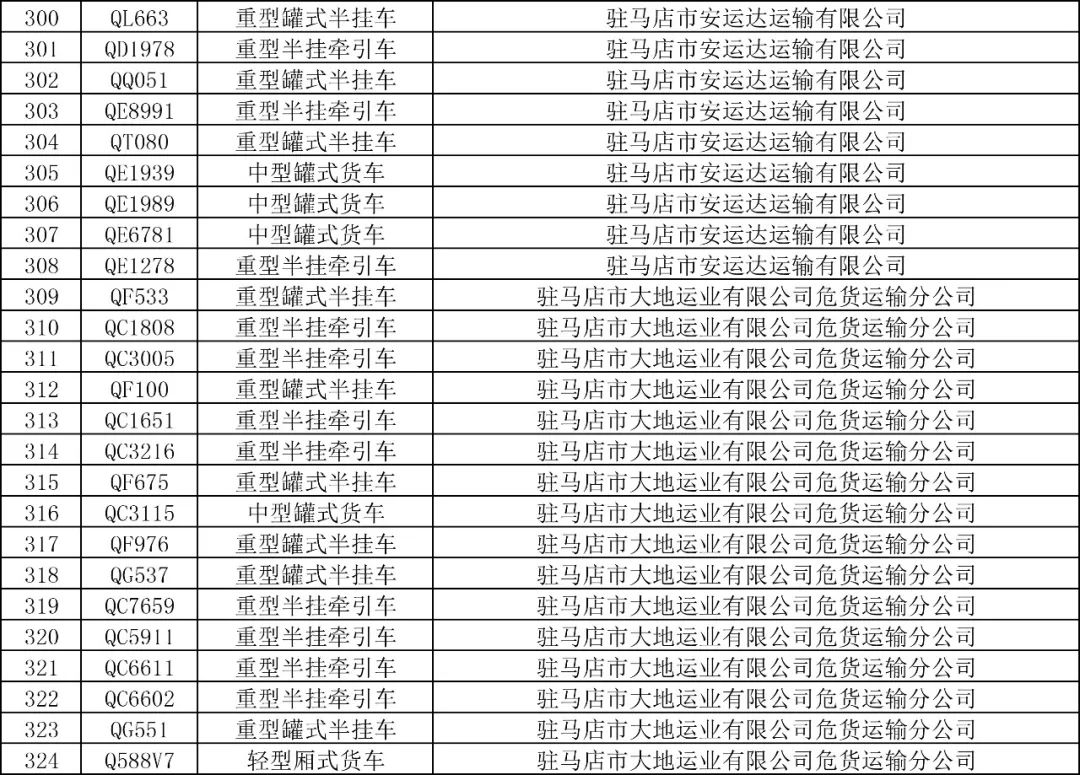 据统计,截至2024年1月4日,以下附属表中的危化品运输车辆存在“逾期未报废、逾期未检验”安全隐患。为进一步减少交通事故的发生,全力消除安全隐患,增强广大驾驶员的交通安全意识,驻马店交警现向社会曝光以下逾期未报废、逾期未检验危化品运输车辆名单。请各运输企业切实履行交通安全主体责任,迅速进行车辆安全状况检验,及时办理车辆报废手续,按照要求接受交通违法处理,汲取违法教训,安全文明出行。(如已办理,请忽略)。