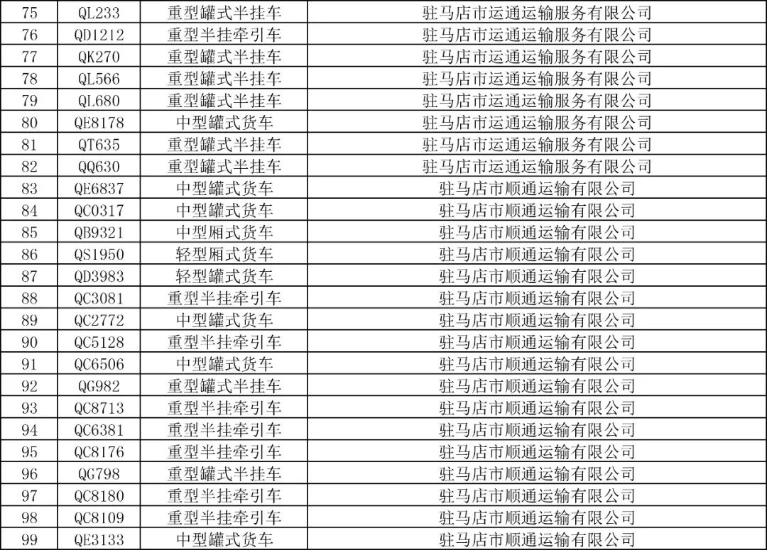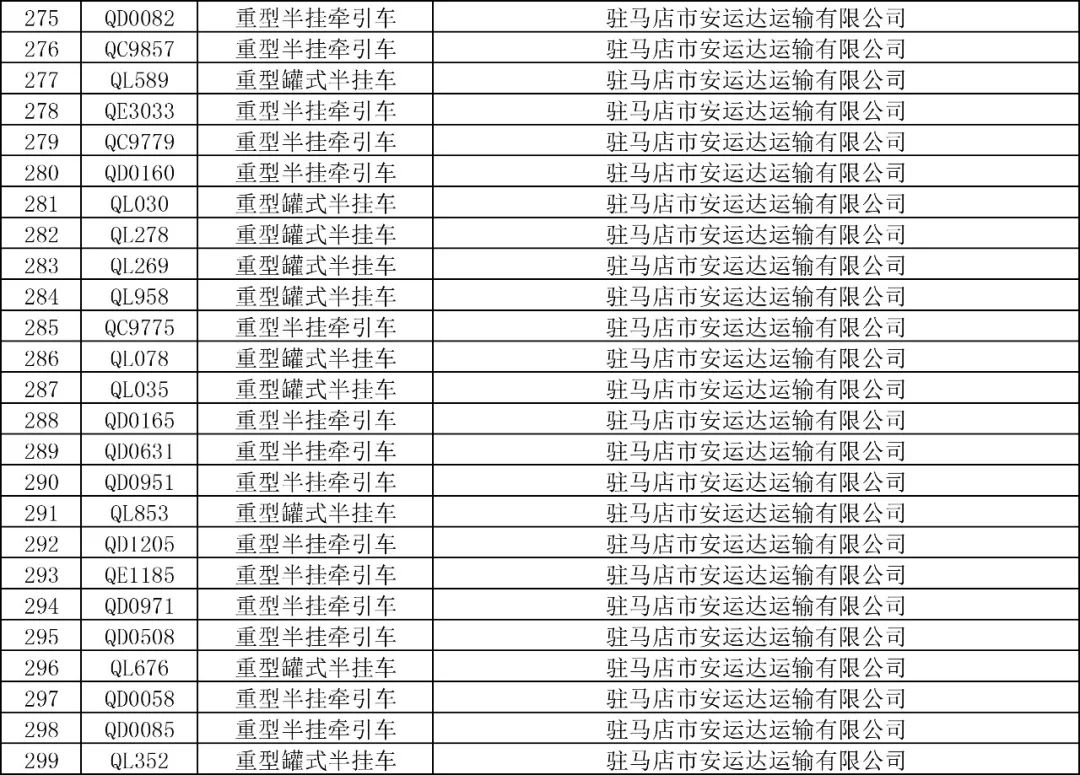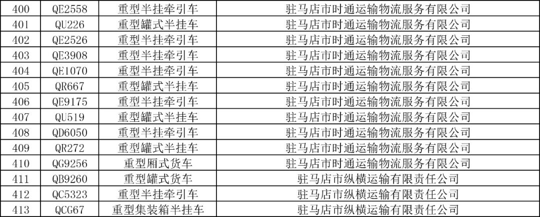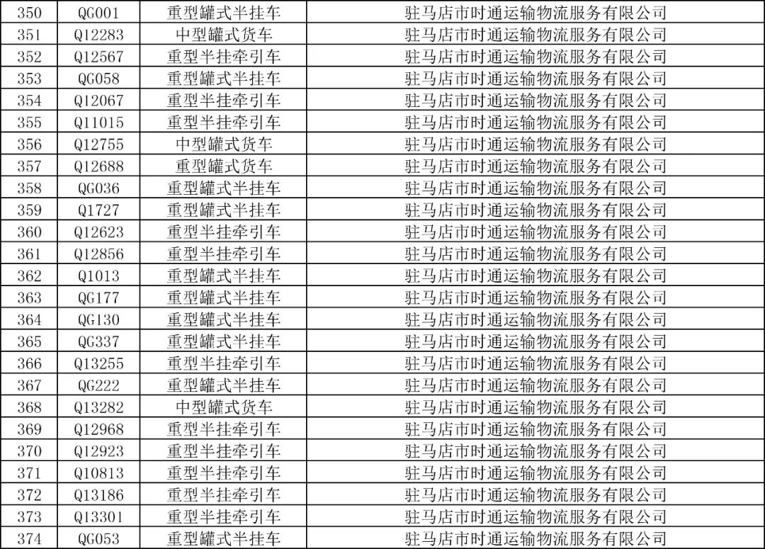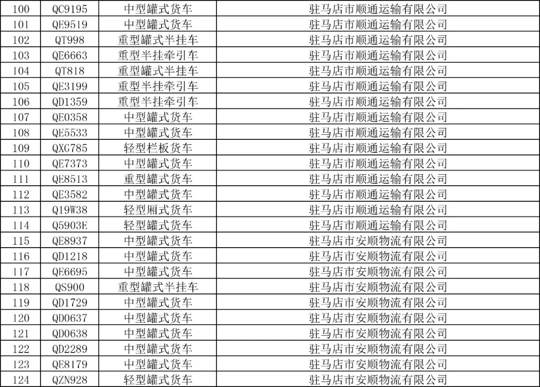 据统计,截至2024年1月4日,以下附属表中的危化品运输车辆存在“逾期未报废、逾期未检验”安全隐患。为进一步减少交通事故的发生,全力消除安全隐患,增强广大驾驶员的交通安全意识,驻马店交警现向社会曝光以下逾期未报废、逾期未检验危化品运输车辆名单。请各运输企业切实履行交通安全主体责任,迅速进行车辆安全状况检验,及时办理车辆报废手续,按照要求接受交通违法处理,汲取违法教训,安全文明出行。(如已办理,请忽略)。