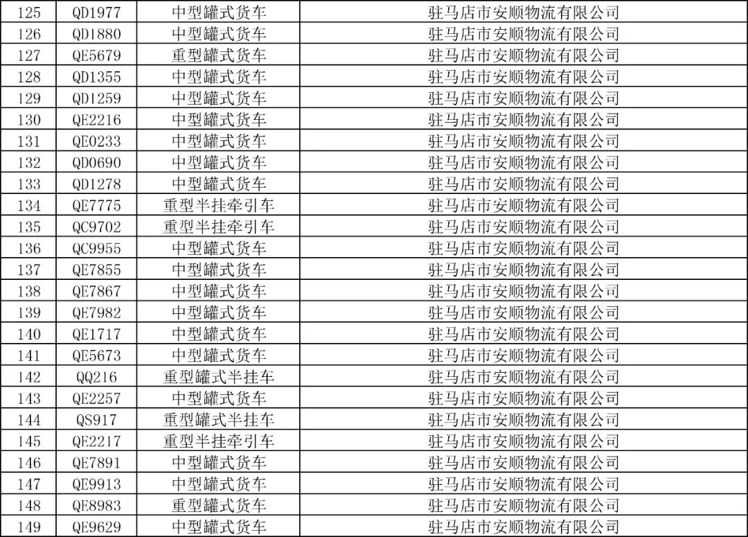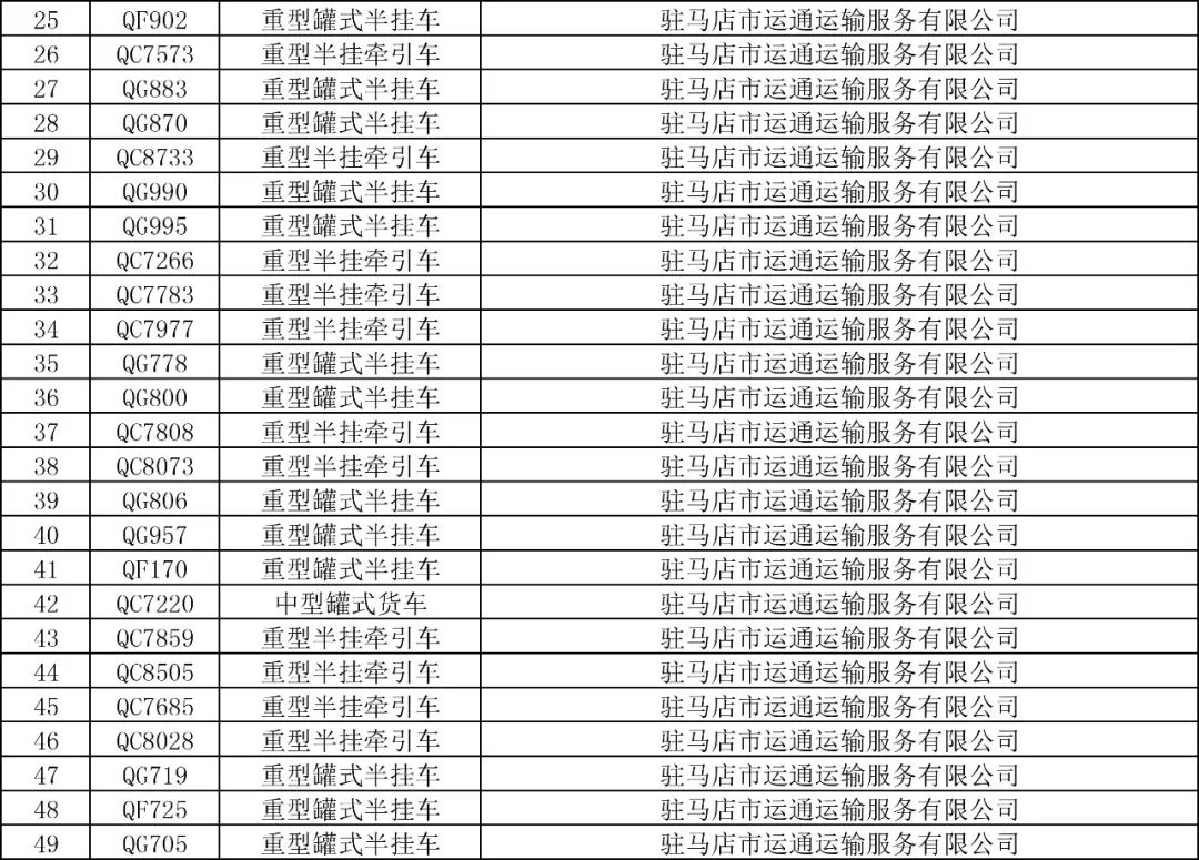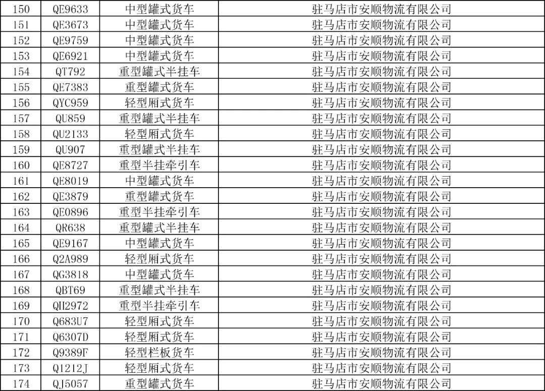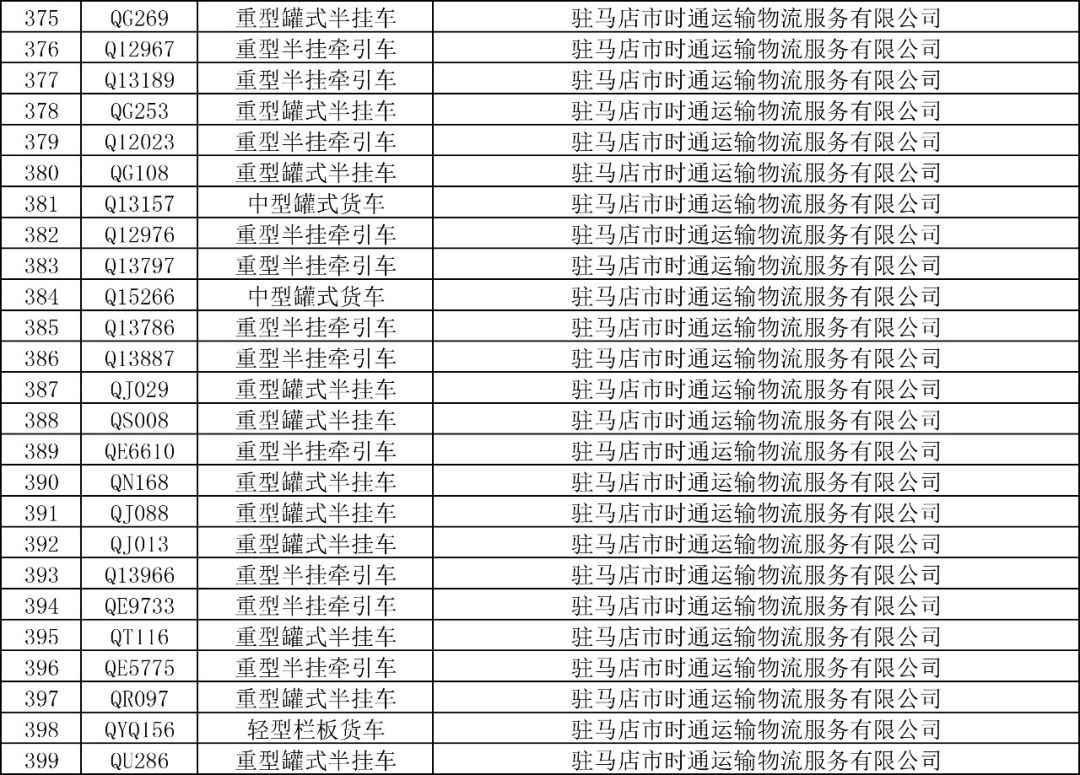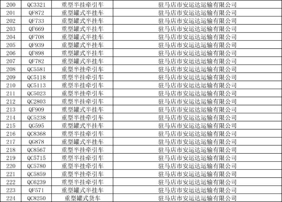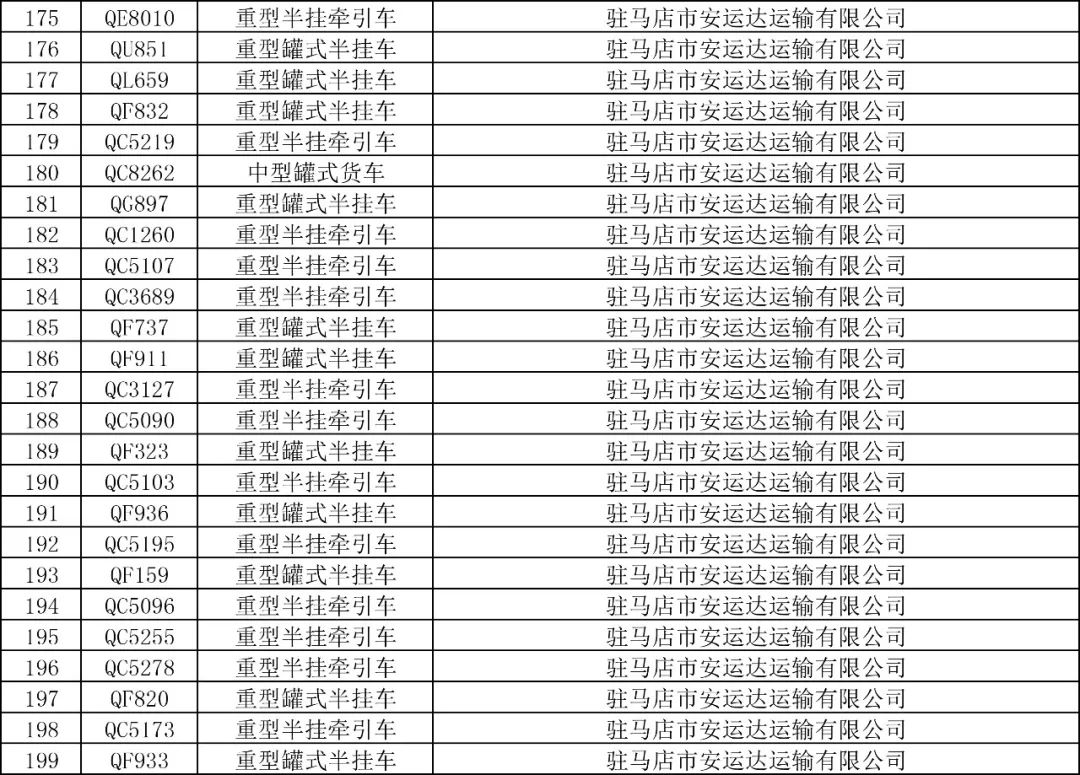 据统计,截至2024年1月4日,以下附属表中的危化品运输车辆存在“逾期未报废、逾期未检验”安全隐患。为进一步减少交通事故的发生,全力消除安全隐患,增强广大驾驶员的交通安全意识,驻马店交警现向社会曝光以下逾期未报废、逾期未检验危化品运输车辆名单。请各运输企业切实履行交通安全主体责任,迅速进行车辆安全状况检验,及时办理车辆报废手续,按照要求接受交通违法处理,汲取违法教训,安全文明出行。(如已办理,请忽略)。