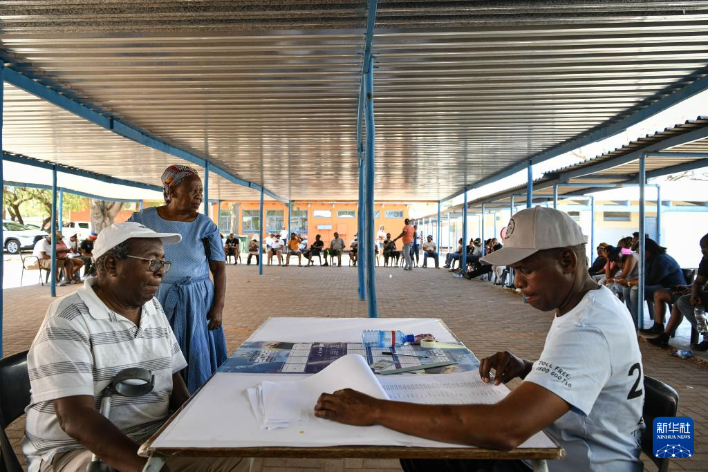 10月30日,选民(右)在博茨瓦纳南部区莫舒帕村的一处投票站投票。新华社记者 韩旭 摄