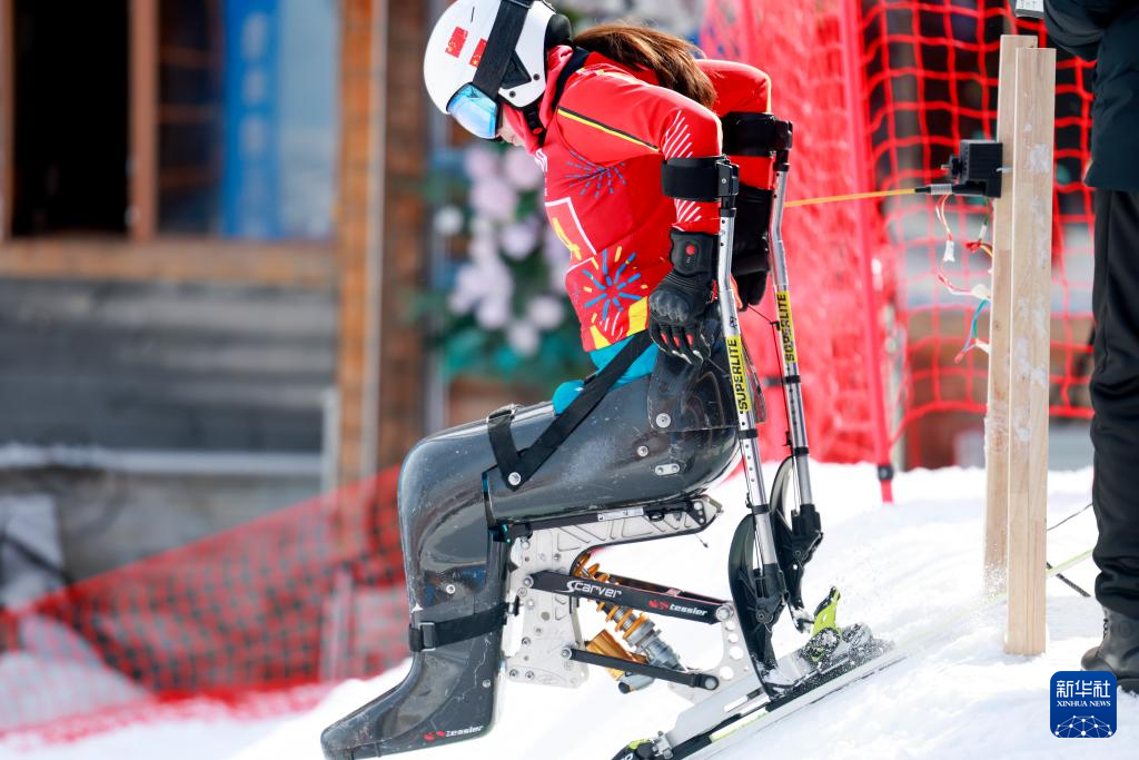 3月5日,辽宁省代表队选手刘思彤在女子坐姿组滑降比赛中。最终她获得本组别第一名。