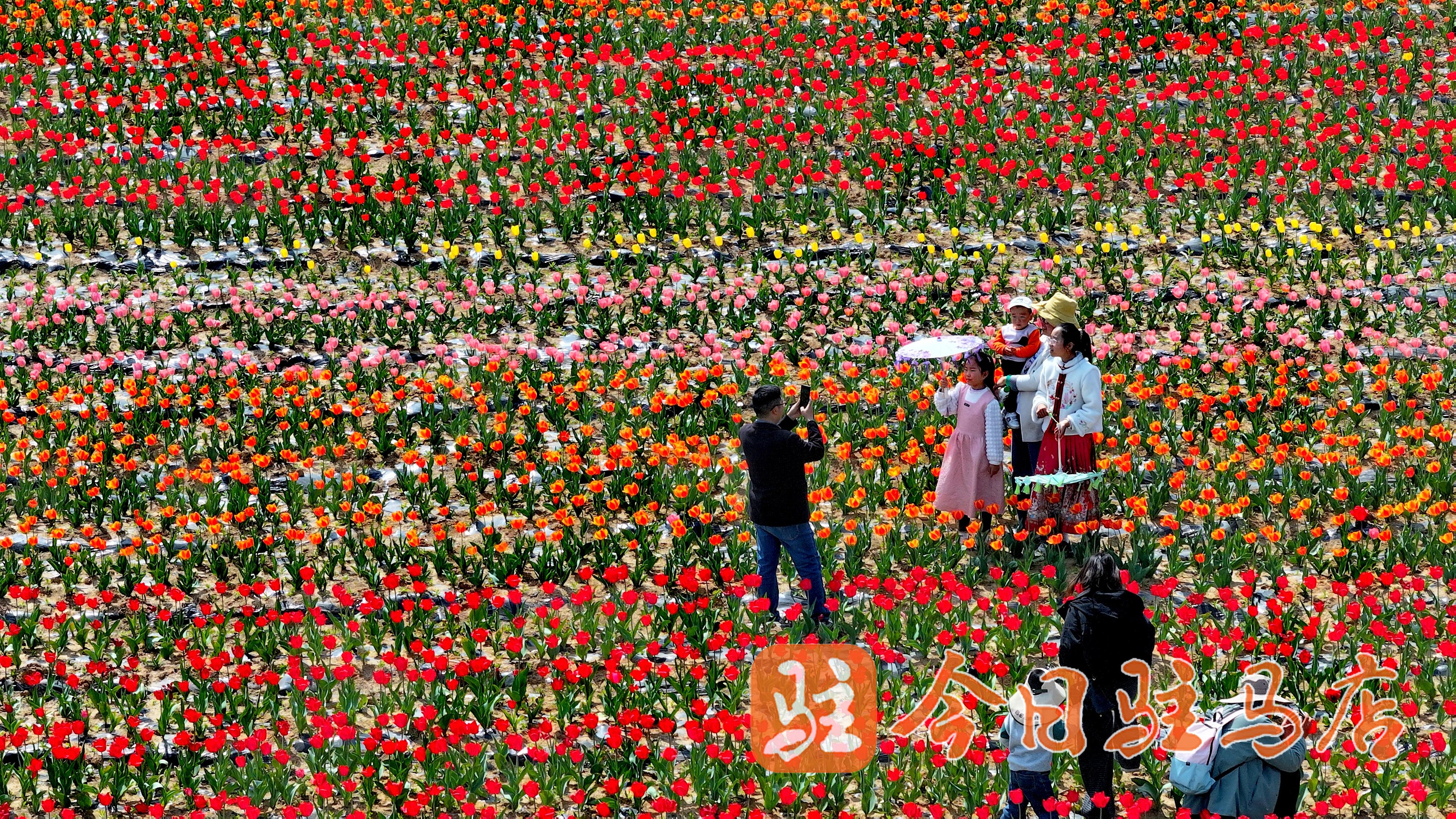 嵖岈山郁金香主题文化园,数百万株郁金香竞相绽放,人们悠然漫步在郁金香花田中,五彩斑斓的花朵恰似天边的彩霞,配上蓝天白云、远山绿树,吸引市民游客纷至沓来,赏花观景,拍照打卡。