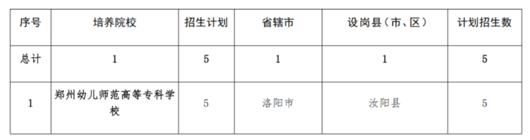 全省计划定向招收专科层次“学前教育”地方公费师范生5人,由培养高校在当年核定的普通招生计划总规模内统筹安排,均为师范类,计划类别为地方公费师范生,招生计划见附件5。