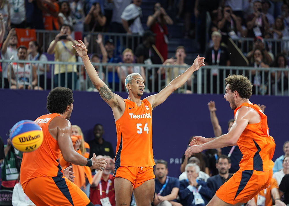 2024年8月5日,荷兰队球员庆祝夺冠。当日,巴黎奥运会三人篮球男子金牌赛中,荷兰队战胜法国队,获得冠军。新华社记者 朱峥 摄