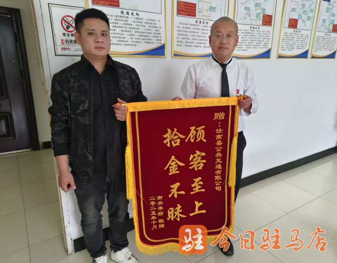 10月5日下午,汝南县公交总站内上演了一幕温馨场景:市民李先生手捧一面印有“拾金不昧,顾客至上”字样的锦旗,专程来到调度室向3路公交车驾驶员杜东表达感谢。