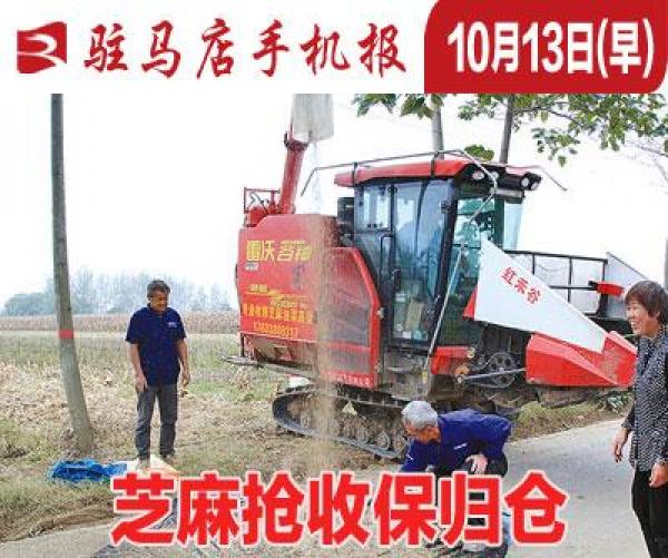 9日,新蔡县孙召镇郎庄村广袤的田野里机声隆隆,800余亩芝麻迎来了收获期。几台大型联合收割机来回穿梭,开足马力对芝麻进行抢收。(记者 熊国森 通讯员 杨琳琳)