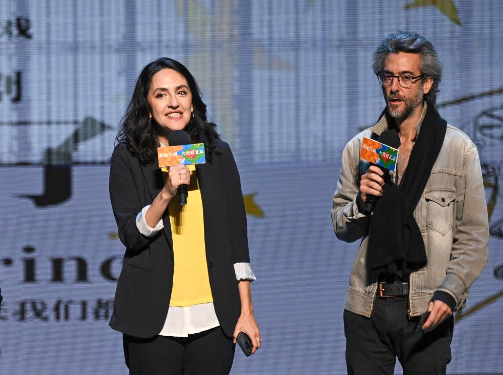 10月12日,在位于北京的中央歌剧院剧场,音乐戏剧《小王子》导演让·贝洛里尼(右)、总制作人安娜出席发布会。新华社记者 金良快 摄