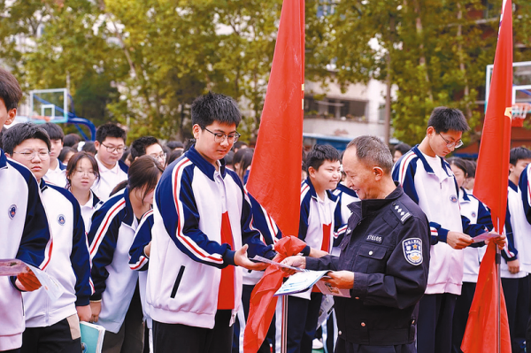 近日,驿城公安分局新华派出所民警走进育英中学开展普法宣传活动。民警围绕校园欺凌、电信诈骗、毒品危害、交通安全、防溺水等内容,向学生们讲解实用安全知识和自救技能。