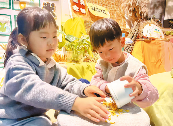 活动中,各班级教师采用观看视频、阅读绘本等方式,带领幼儿了解世界粮食日的由来,让孩子们知晓粮食的播种、生长、收割过程。