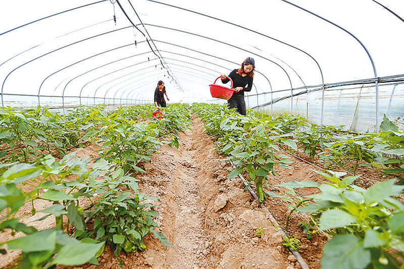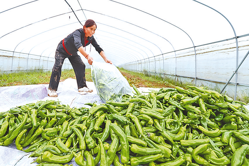 近日,在正阳县王勿桥乡新丰村蔬菜大棚基地,农户正在采收辣椒。据了解,该村利用200多座大棚规模化发展蔬菜产业,通过“基地+农户”模式,有效带动村民实现家门口就业增收。