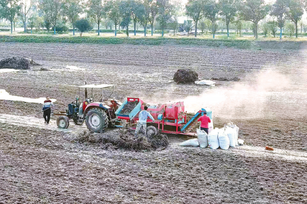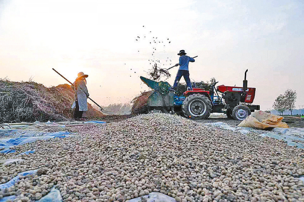 日前,正阳县清源街道李通村村民在地里抢收花生。