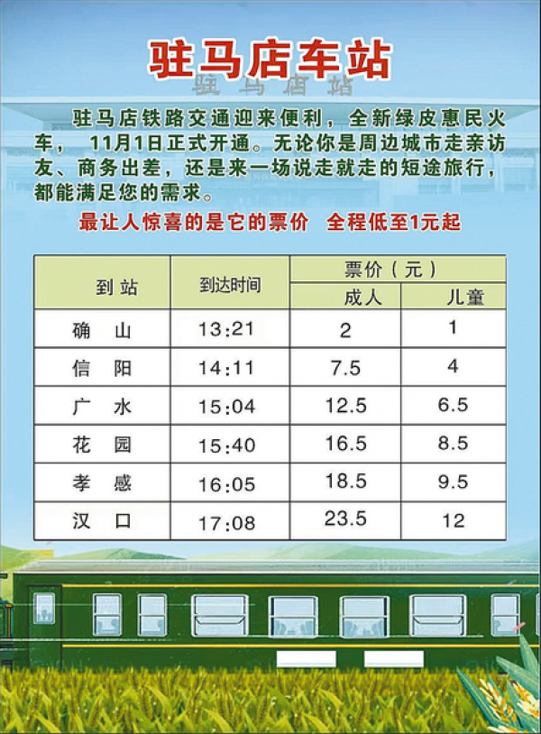国庆、中秋双节运输结束后,铁路部门聚焦旅客出行需求,一边升级服务保障,一边推出普惠性列车。此次新开行的4803次列车,为群众出行再添实惠:驻马店到确山仅2元,到信阳7.5元,至广水12.5元、孝感18.5元,到终点站汉口只要23.5元,所有儿童均可享受半价优惠。