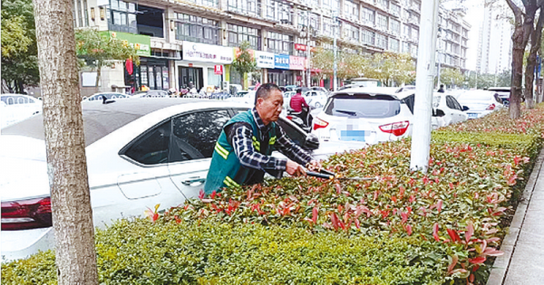 园林工人在修剪绿化带。