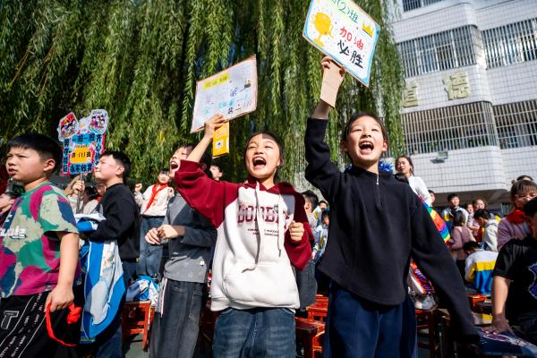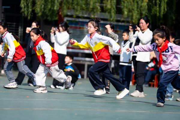 运动赛场上,处处可见孩子们拼搏的身影。跳绳区,参赛选手们手腕飞快转动,绳子在空中发出“嗖嗖”的声响,小脸涨得通红却依然坚持;三人四足比赛中,孩子们相互搀扶,喊着整齐的“一二一”,虽有踉跄却始终不放弃;拔河赛场呐喊震天,小选手们紧握麻绳,身体后倾,使出全身力气为班级荣誉而战。场下的拉拉队员们更是热情高涨,“加油!加油!”的助威声此起彼伏。