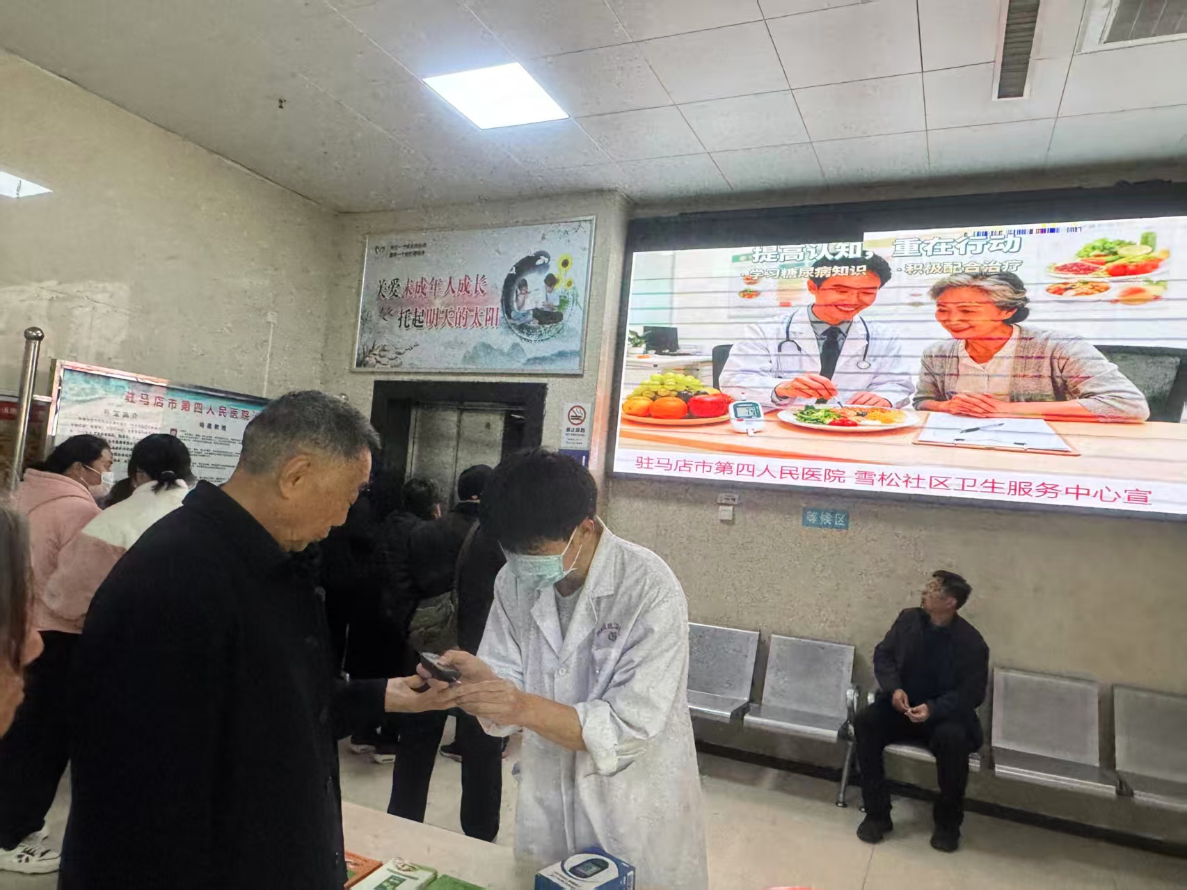 宣传活动现场,市第四人民医院利用电子显示屏播放糖尿病日宣传主题,摆设宣传桌椅,为来往群众开展血压测量、血糖监测、健康教育、发放宣传手册。倡导“提高认知,重在行动,关注职场糖尿病”。强化重点人群糖尿病防治意识,引导群众了解常见防控知识和技能,控制超重、肥胖、高油高糖饮食、吸烟、室内外环境污染、职业暴露等危险因素,培养健康生活方式,降低糖尿病及其并发症的发生风险和危害。