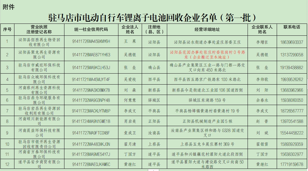 附件:驻马店市第一批电动自行车锂离子电池回收企业名单