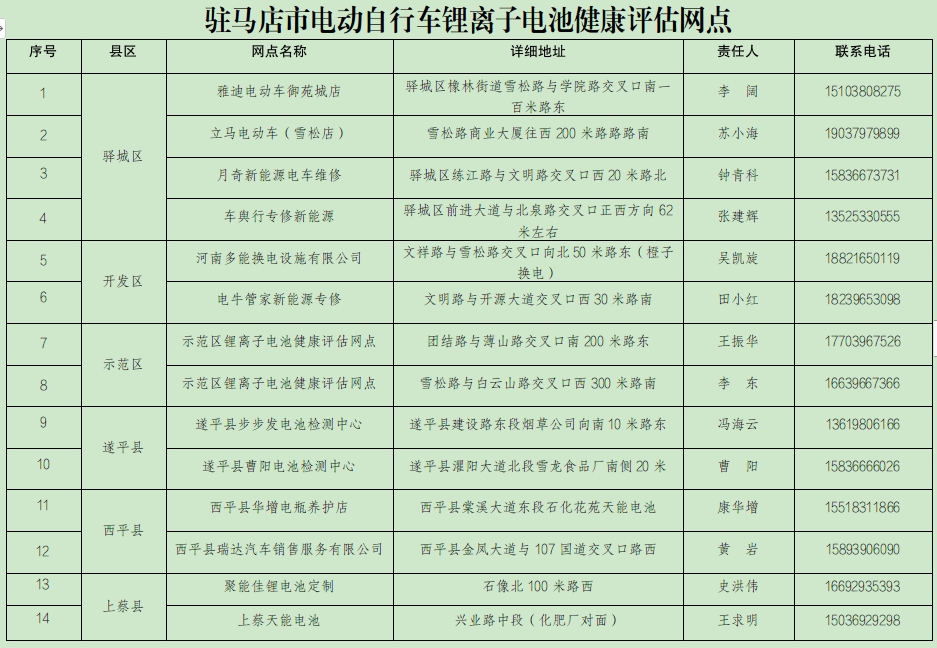 为降低电动自行车电池使用过程中的各类火灾风险,切实保障人民群众生命财产安全,提升电动自行车安全隐患全链条整治成效,目前驻马店市新调整网点1个,新增网点4个,共建成29个锂电池健康评估服务网点,各县区群众可根据需要就近到当地锂电池健康评估网点,免费提供锂离子电池检测服务。