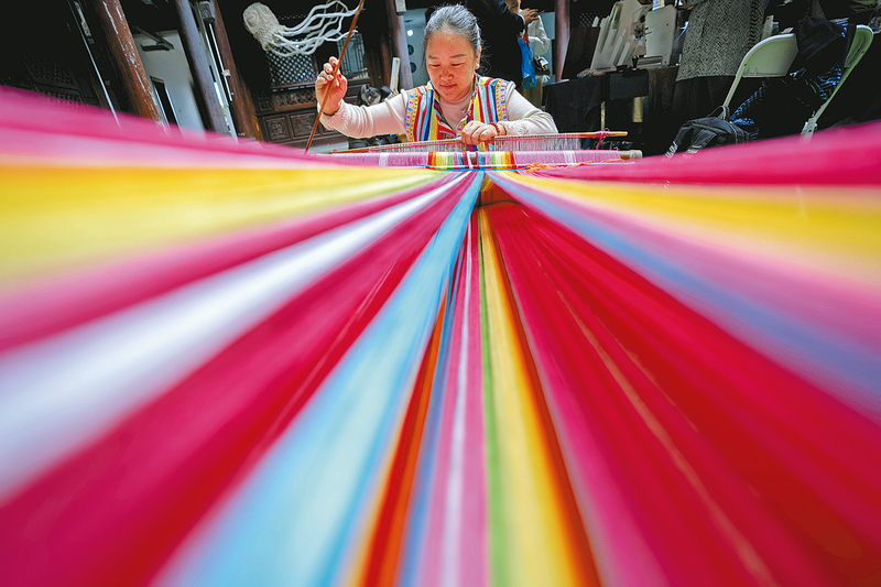 11月23日,独龙毯制作技艺展台的工作人员在2025非遗品牌推广周上制作独龙毯。11月23日,2025非遗品牌推广周启动仪式在云南省大理市举行。本次推广周集中展示了来自全国各地富有特色、具有较高知名度和影响力的120余家非遗品牌。 新华社记者 胡 超 摄