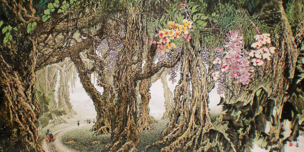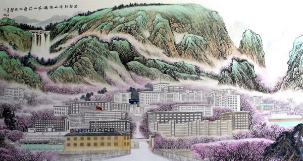 除了《世博园游春图》,王恩松的其他作品如《石林雨后》《挺进高原》《神圣的香格里拉》《仙湖风云》等,也都各具特色。《石林晨曲》中,奇石异水、飞瀑险潭,飘然灵秀,不时一人一亭默然山水间,充满了“禅”气;《情系高原》则在孤烟荒漠、落日长河的豪放壮美中,因一位牧羊老人和几只乖巧的小羊,多了几分柔情和亲情。