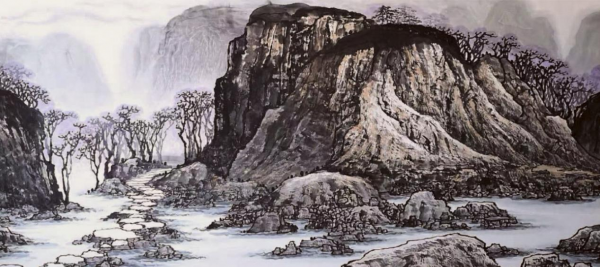 王恩松的“中国重墨画”注重以细部的精妙构思来点化作品的人情味。在他的画中,常常出现一间茅屋、一方亭阁、一座小桥、一个人影,这些细节不仅增添了画面的生活气息,更点出了作品的主题,使整个画面充满了生机和意趣。他能放也能收,在激情挥洒笔墨之后,又能巧妙地收回,在山水间开辟出另一番意境,给人以惊喜和震撼。