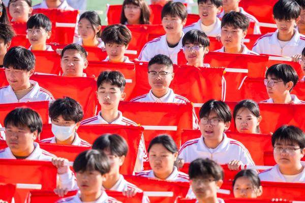 上午九时,开幕式在雄壮的国歌声中拉开帷幕。护旗手迈着铿锵有力的步伐护卫国旗入场,全场师生肃立行注目礼。
