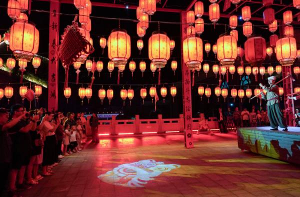 2024年5月12日,游客在西安长安十二时辰主题街区内观看演出。街区通过汉服旅拍、演艺互动、非遗体验等项目,让游客“穿越”回盛唐长安,为游客打造科技感、文化味十足的游历体验。