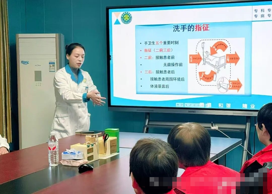 保洁工作绝非简单的清扫除尘,而是院感防控体系中不可或缺的关键环节。培训现场,感控办讲师用通俗易懂的语言,系统解读了院感的基本概念、传播途径及防控核心要点,重点围绕环境清洁消毒规范(如高频接触物表“由洁到污”擦拭流程、一床一巾使用标准)、手卫生“两前两后”原则、医疗废物分类处置(含锐器盒规范使用、“鹅颈结”封口技巧)等实操内容展开详解。针对消毒液配比、血液/体液洒溢应急处理、职业暴露(锐器伤“一挤二冲三消毒四报告”流程)等薄弱环节,讲师通过案例剖析、现场示范的方式,手把手指导大家掌握标准操作流程,确保培训内容贴近实际、学以致用。