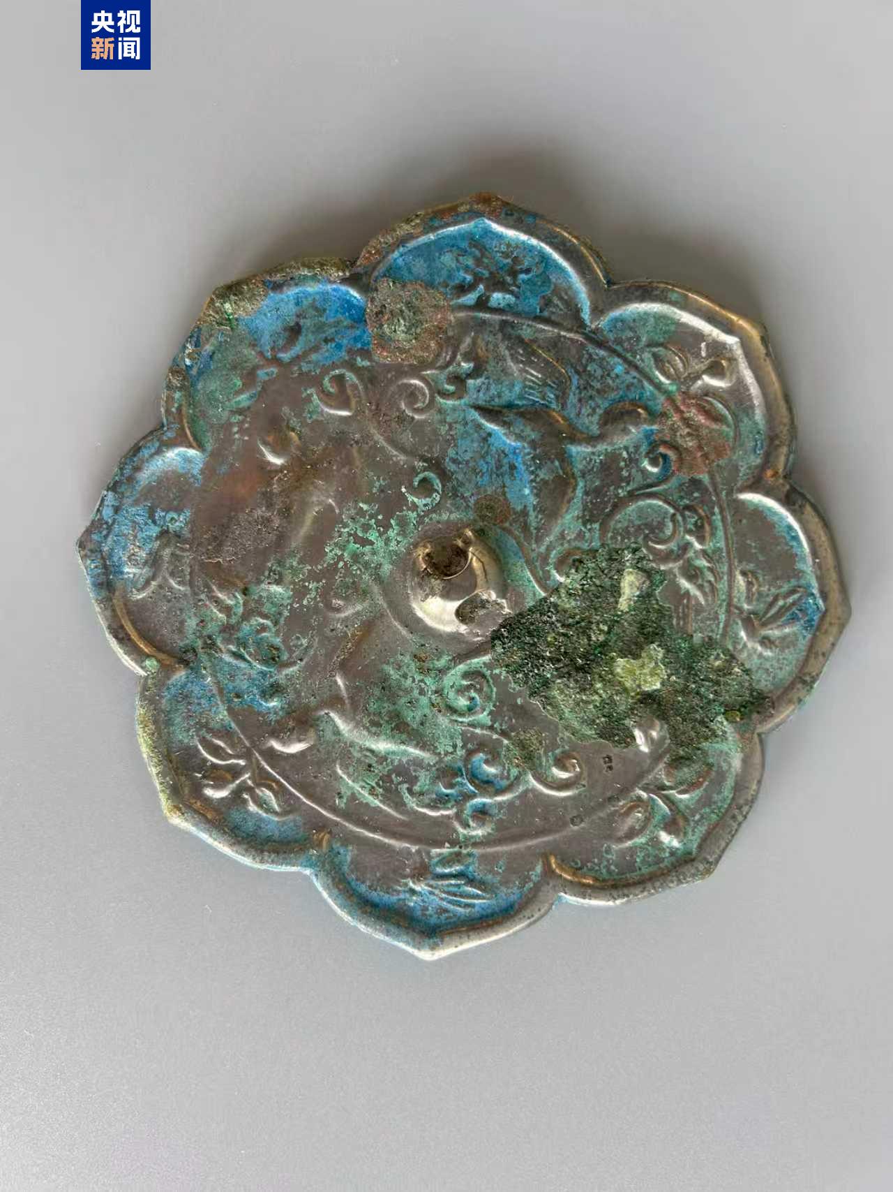 铜镜呈八瓣菱花形,内切圆形,圆纽,纽周边饰鸟纹与花枝纹,缘内蜜蜂、花叶相间排列。